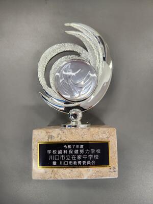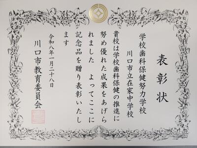 今回の受賞は、保健委員会中心で行っている歯みがき強化週間や学校保健委員会での発表等により、在家中生全体で健康意識を高め、行動にうつしたことが認められた結果だと思います。