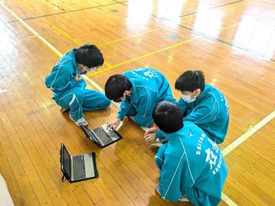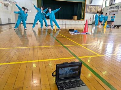 タブレット端末から課題となる音楽を流したり、自分たちの動きを映像に撮ってみたり、歌詞を調べて振付の参考にしたりとグループごとに様々に工夫しながら練習を進めている様子が見られました。