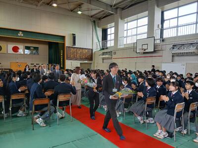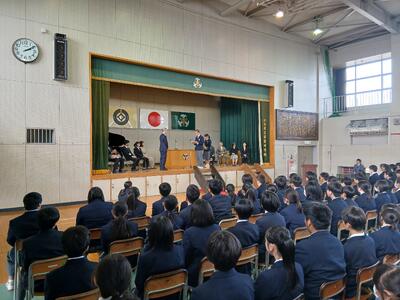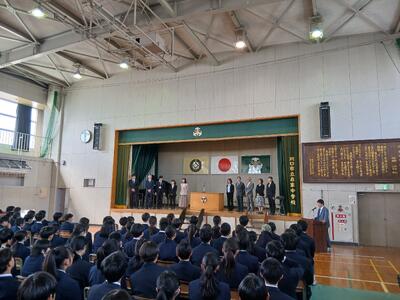 昨年度で在家中学校を去られた先生方をお招きして離任式が行われました。